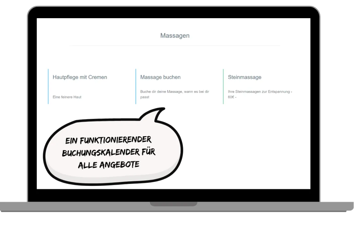 Unsere All-in-One Massagesoftware ist eine umfassende Lösung, die speziell für Massageunternehmen entwickelt wurde. Sie beinhaltet eine professionelle Website mit integrierten SEO-Funktionen, ein intelligentes Buchungssystem mit automatischer Terminvergabe, Stornierungsverwaltung und Erinnerungsmails, Marketing-Tools wie Bewertungsoptimierung und E-Mail-Newsletter, eine intuitive Verwaltungsoberfläche (auch per App), KI-gestützte Buchungsfunktionen für Social Media und WhatsApp, eine Anruffunktion sowie detaillierte Analysedaten.